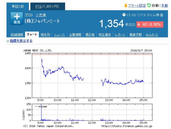 何よ、今日のジャパンミートの株価推移ったら、いきなりマイナス転換から始まってジリジリ下げていくばっかり。。