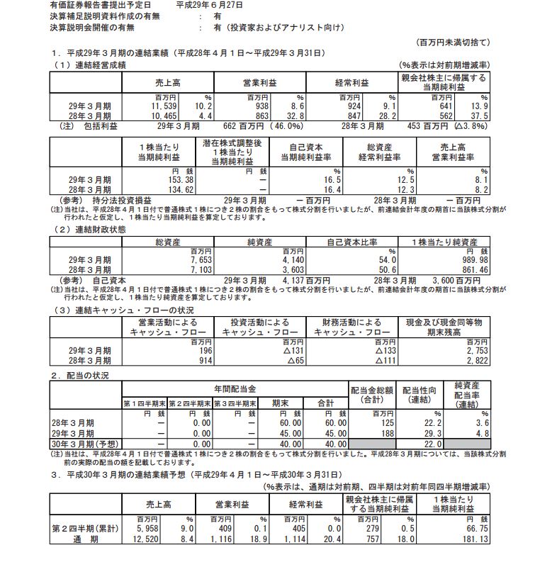経常利益が対前年比プラス17.9%で、来期の予想がプラス13.3%と二桁成長が継続してくれるようです。さらに立会外分売の発表も同じく実施してきましたので、まさに「最短で東証1部への昇格を目指す」という社長の言葉に嘘はなかったようです。