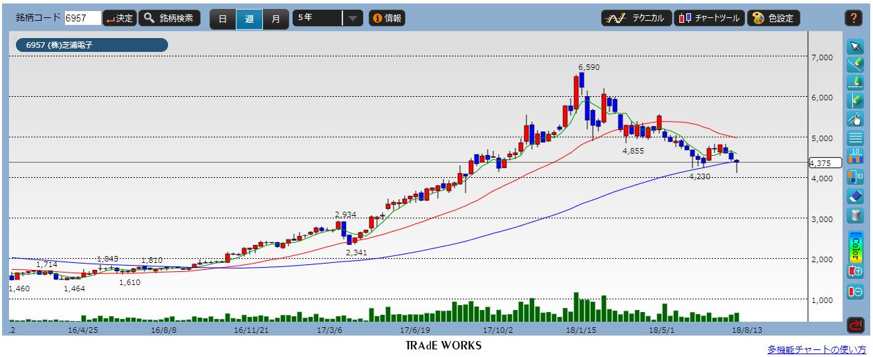 芝浦電子のチャートを見てみると、日足チャートはこんな感じです。