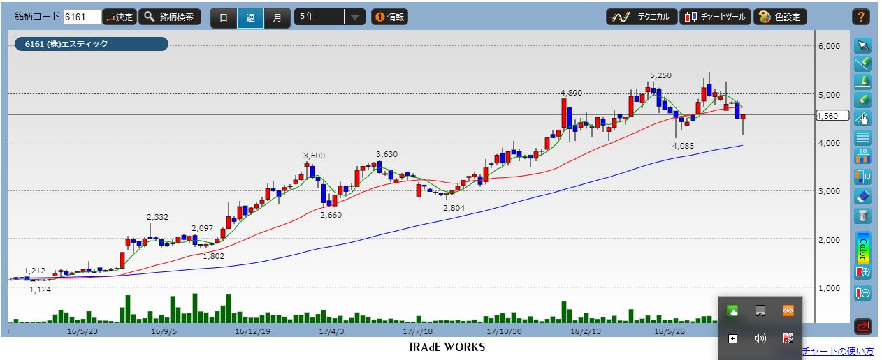 エスティックの場合、日々の出来高がちょっと少なすぎるので日足チャートだとなんだかブレる感じがいつもするんです。